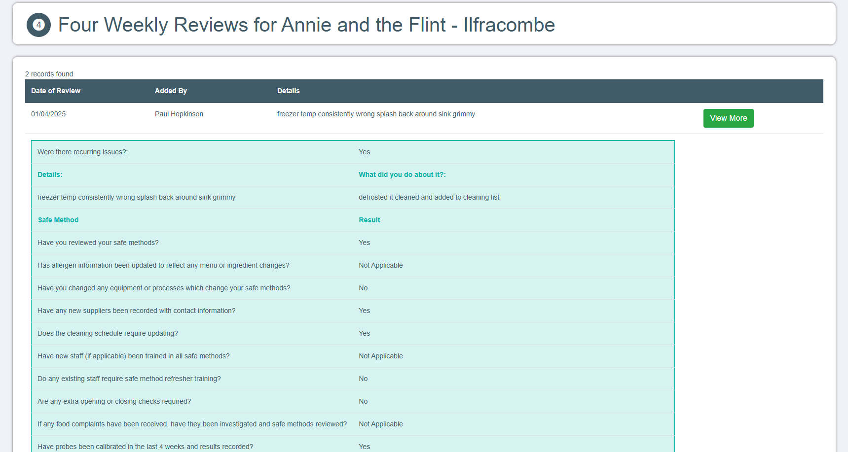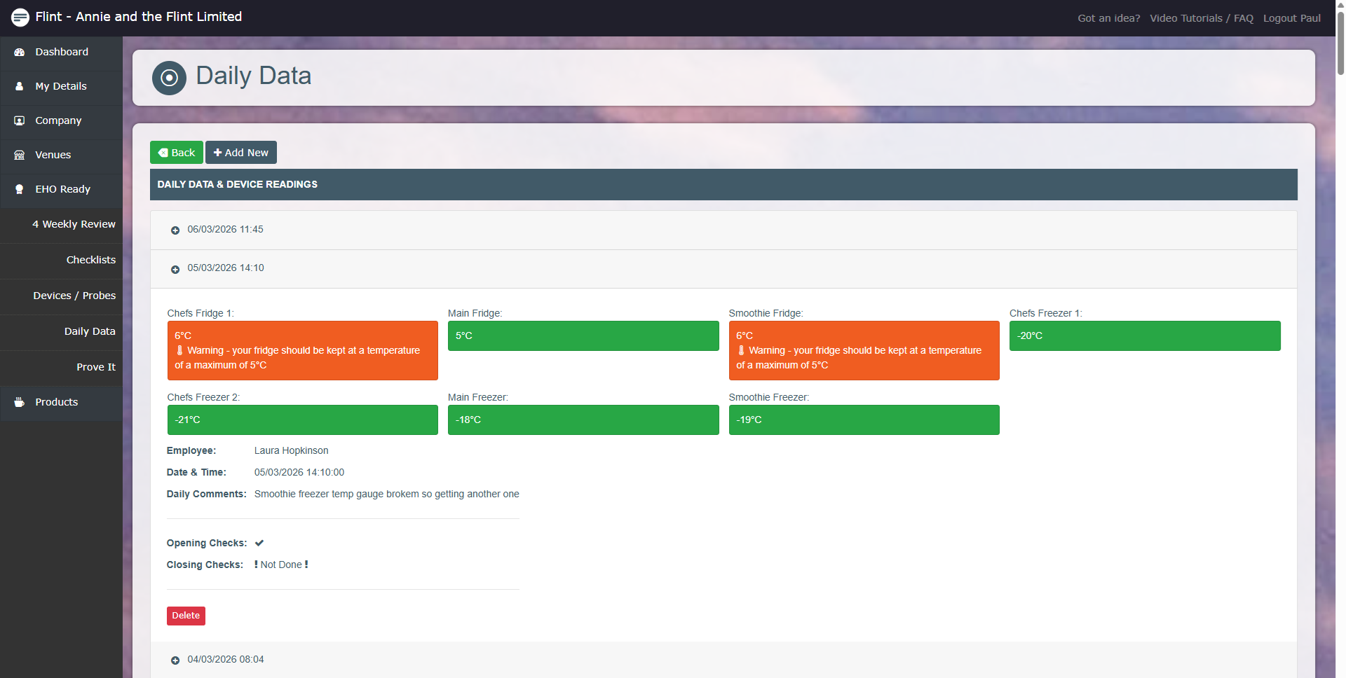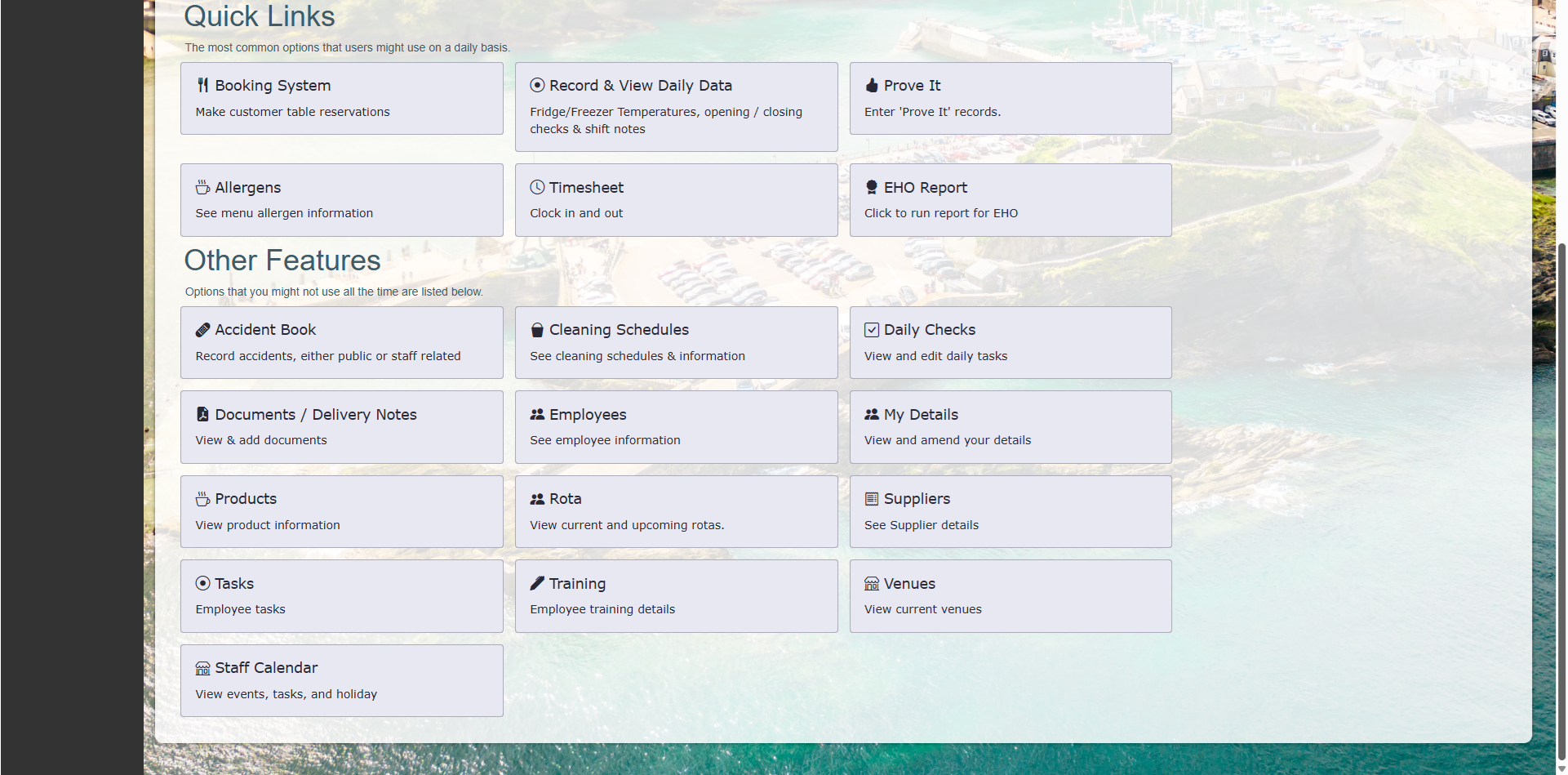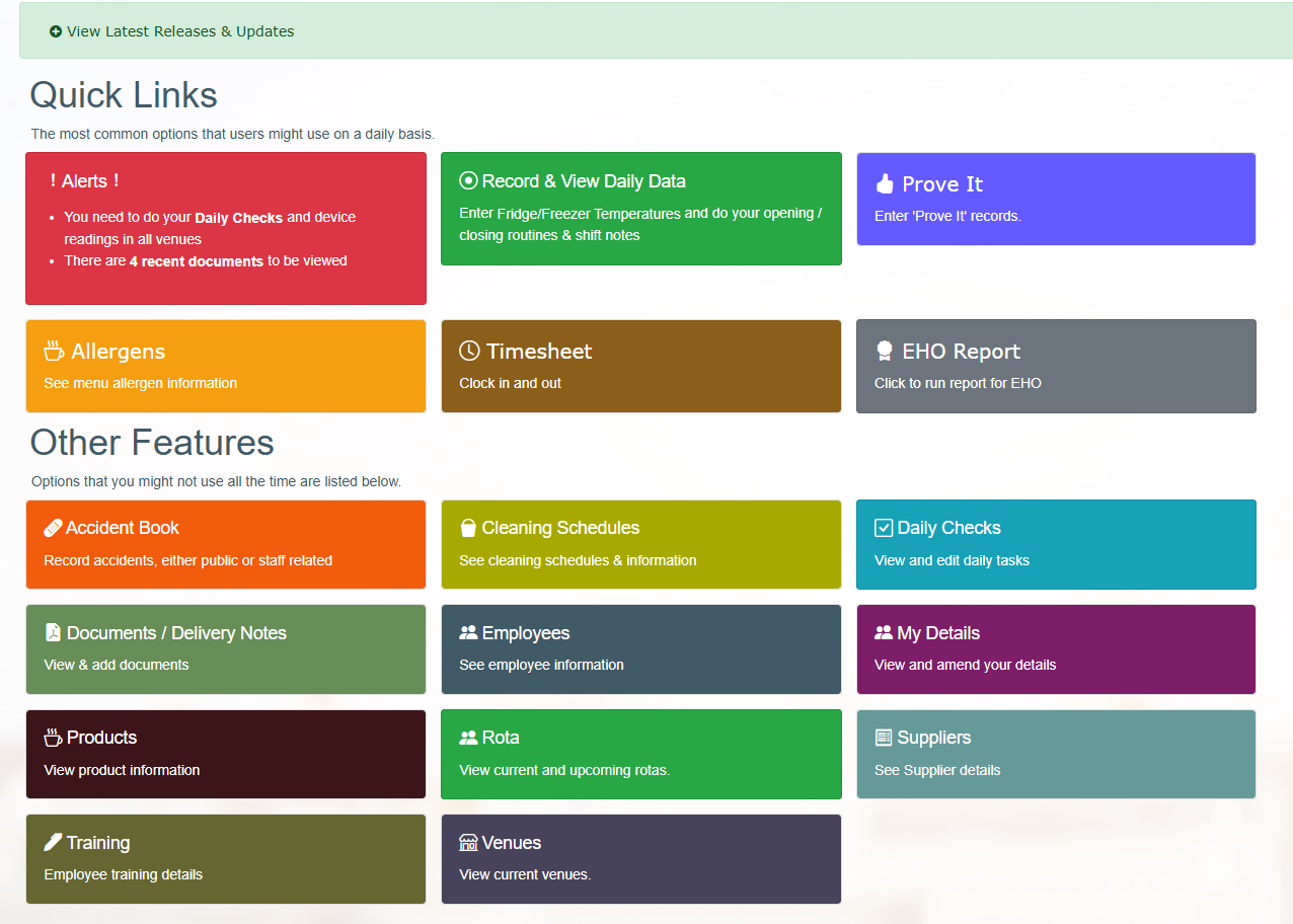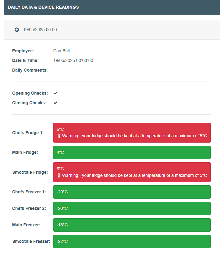 You can manage all your temperature info, your daily checks (whose done them and when), your prove it records, probe calibrations, cleaning schedules, allergens, four weekly reviews & employee training.