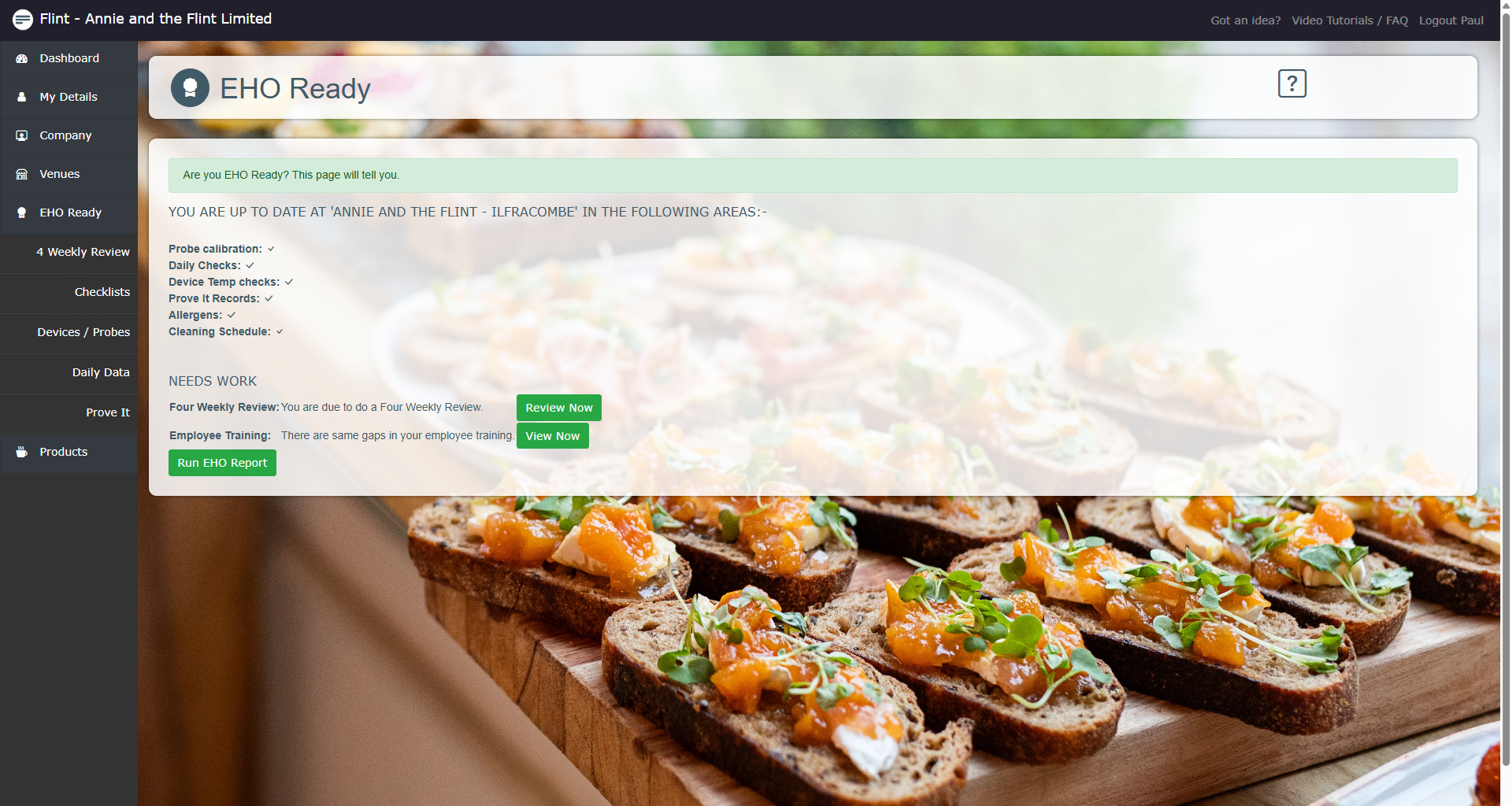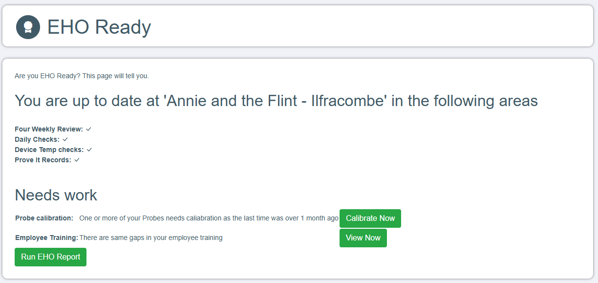 Yes - this was our main aim in building the app - so you would know at a moments notice how prepared your venue is for an EHO visit. We produce a comprehensive EHO report with all the paperwork elements that they would expect to see on a visit for daily temperature records, prove it data, cleaning schedules, staff training, daily checks etc etc
