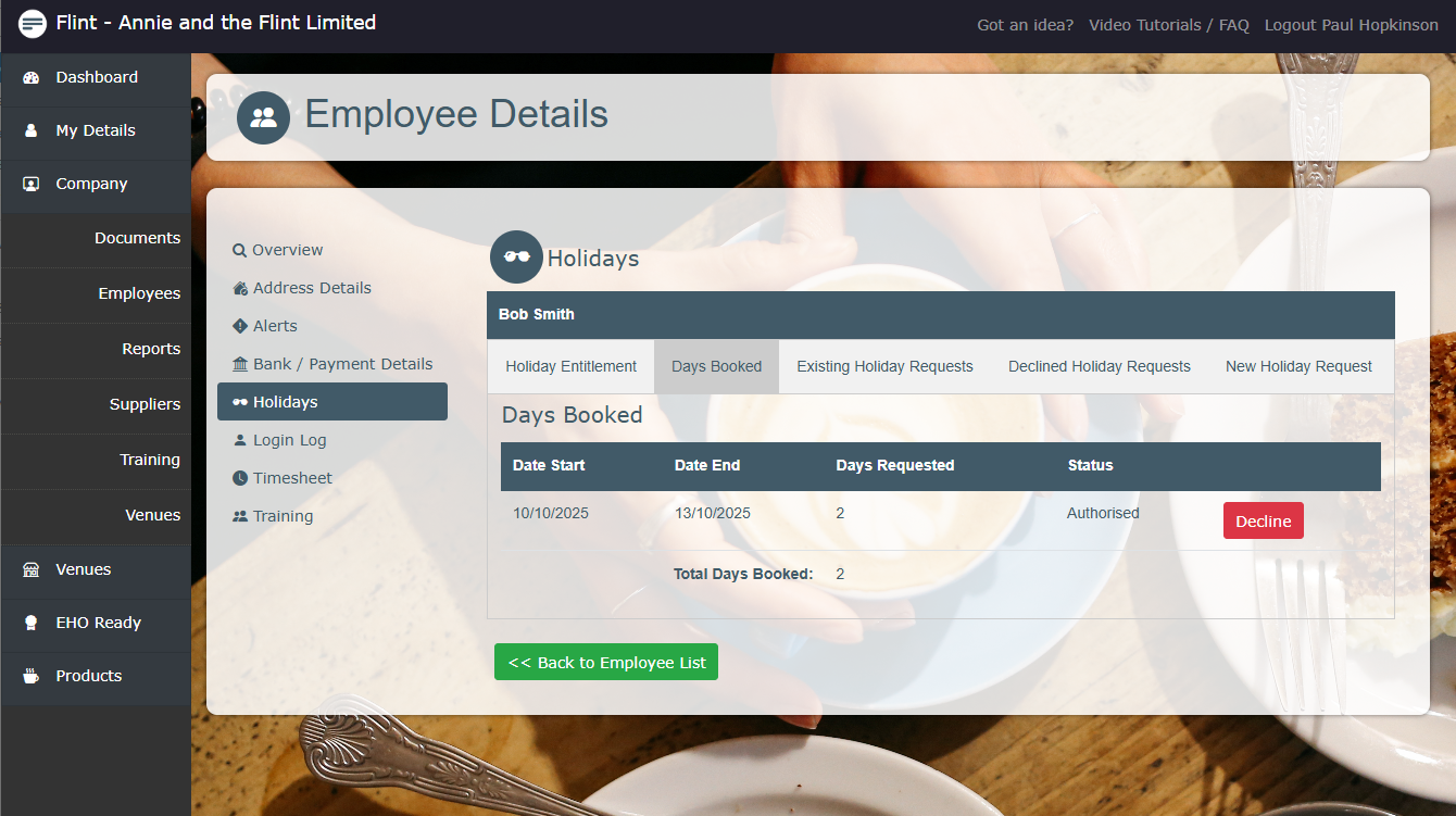 'Flint has been a game changer for us - as a small independent coffee shop we didnt always have the time to do all the admin tasks that were required for our EHO visits. Since getting this system our staff have been able to quickly and efficently update the relevant records throughout the day and we are now confident that our record keeping is bang up to date. Our employees love it as they are able to log their hours easily without a 3rd party app or other paper document.' - Annie and the Flint